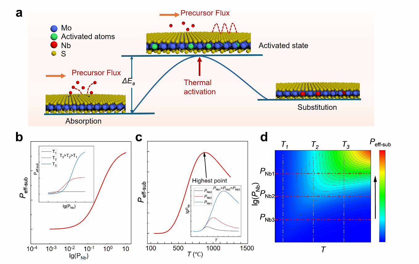 图1|通过MOCVD实现单层MoS₂中的取代型铌掺杂。a,Nb掺杂MoS₂的MOCVD生长过程示意图。b,在蓝宝石衬底上生长的Nb掺杂MoS₂薄膜的光学显微镜图像。c、f,Nb掺杂MoS₂的实验STEM图像与对应的模拟STEM图像。QSTEM模拟采用与实验条件相同的参数。d、e,沿(c)与(f)中所示线条方向获得的强度剖面。g、h,Nb掺杂MoS₂的HAADF-STEM图像及其对应的EELS元素分布图,其中Mo、S和 Nb信号分别以绿色、黄色和紫色表示。比例尺为0.5 nm。i–k,Nb、Mo和S边的放大并拟合后的EELS能谱,显示随着Nb掺杂浓度增加,谱线强度呈现出系统性的演化趋势。原始数据见补充图4。l,与(b)中所示区域对应的、蓝宝石衬底上生长的Nb掺杂MoS₂的AFM图像及其高度剖面。m、n,不同掺杂水平下本征MoS₂与Nb掺杂MoS₂的拉曼光谱和光致发光(PL)光谱。 图2|Nb在MoS₂中取代掺杂的热力学-动力学建模。a,热激活取代机制示意图。Nb前驱体首先吸附在MoS₂表面,随后在热激活作用下实现对Mo晶格位点的取代;能垒ΔEₐ将吸附态与取代态分隔开来。由Nb分压决定的前驱体通量控制表面碰撞频率,并进一步影响取代效率。b,有效取代概率Peff-sub随Nb分压变化关系,表明前驱体通量的增加可显著提高取代概率。插图显示不同温度下的分压依赖趋势。c,有效取代概率 Peff-sub随温度变化关系,由于取代反应与前驱体分解过程之间的竞争,呈现出非单调变化行为。插图展示了在不同前驱体分压条件下的温度依赖趋势。d,Peff-sub随温度与Nb分压变化的等高线图。红色虚线和灰色网格线分别对应(b)和(c)插图中的截面位置。