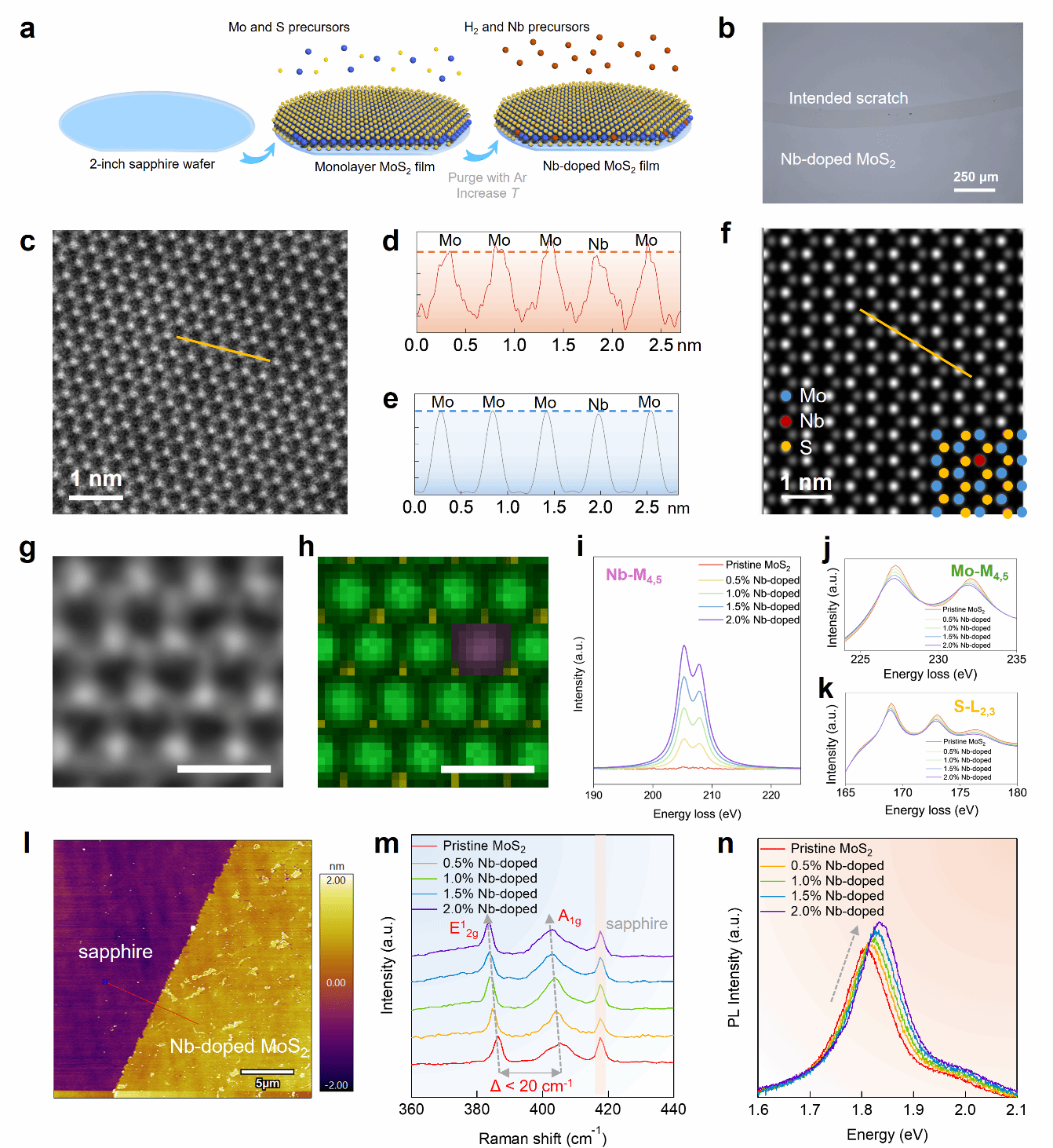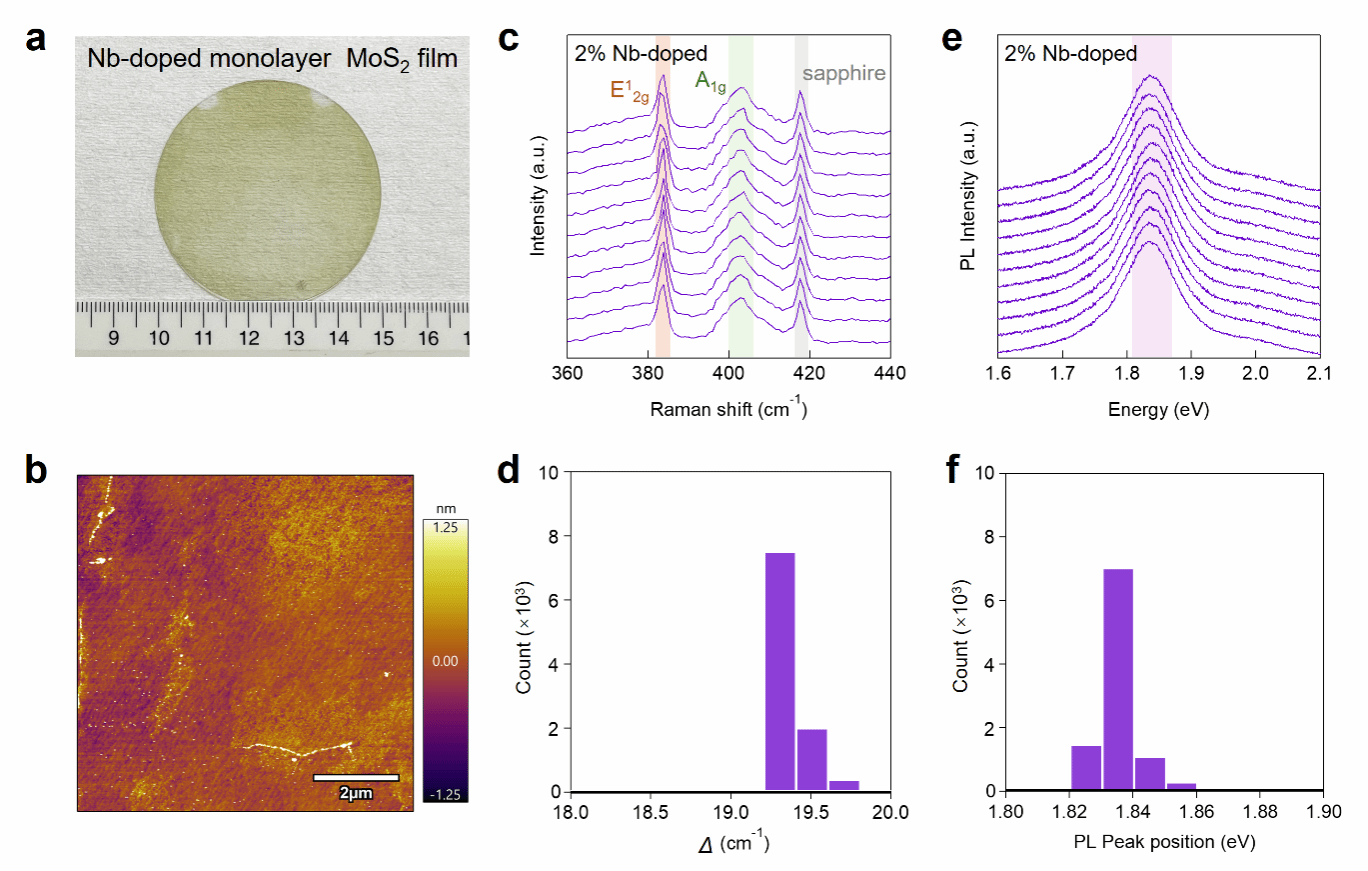 图3|Nb掺杂MoS₂薄膜的晶圆级均匀性表征。a,在2英寸蓝宝石衬底上生长的Nb掺杂MoS₂薄膜的实物照片。b,生长态Nb掺杂MoS₂薄膜的AFM图像,显示其在蓝宝石衬底上具有平整、光滑的表面形貌。c、e,在蓝宝石衬底上的2英寸Nb掺杂MoS₂薄膜上,于室温条件下进行的拉曼与PL线扫描测试,沿径向以5 mm间隔共采集11条光谱。d、f,基于补充图6和7所示映射区域中采集的10,000组光谱数据,统计得到的E12g与A1g拉曼峰间距(△)以及PL峰位的分布情况。