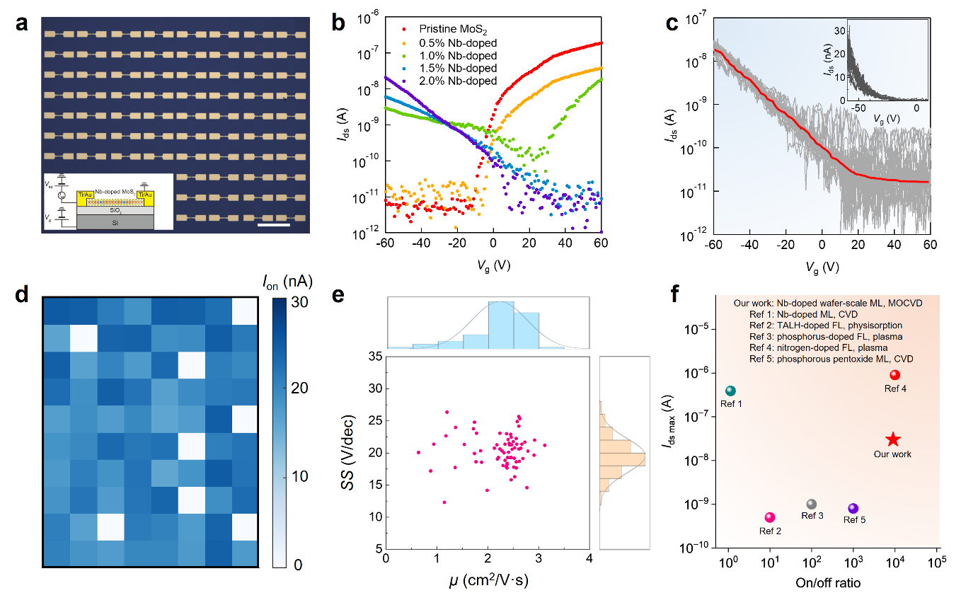 图4|晶圆级Nb掺杂MoS₂的电输运特性。a,将Nb掺杂MoS₂薄膜转移至Si/SiO₂衬底后制备的双端器件阵列的光学显微镜图像。插图为双端器件的侧视结构示意图。比例尺为100 μm。b,不同Nb掺杂浓度下Nb掺杂MoS₂的栅控特性,并与本征MoS₂进行对比。c,(a)中所示阵列内、基于2% Nb掺杂MoS₂制备的80个场效应晶体管器件的栅控特性。插图为线性坐标下的数据展示。d,在Vds = 100 mV、Vg = −60 V条件下,2% Nb掺杂MoS₂在80个FET器件中的开态电流分布。e,(c)中所示器件的场效应迁移率和亚阈值摆幅(SS)的统计分布。f,不同研究中通过多种掺杂元素和制备方法实现的p型MoS₂ 器件性能对比,其中“ML”表示单层,“FL”表示少层。 原文链接:https://www.nature.com/articles/s43246-025-01065-x |