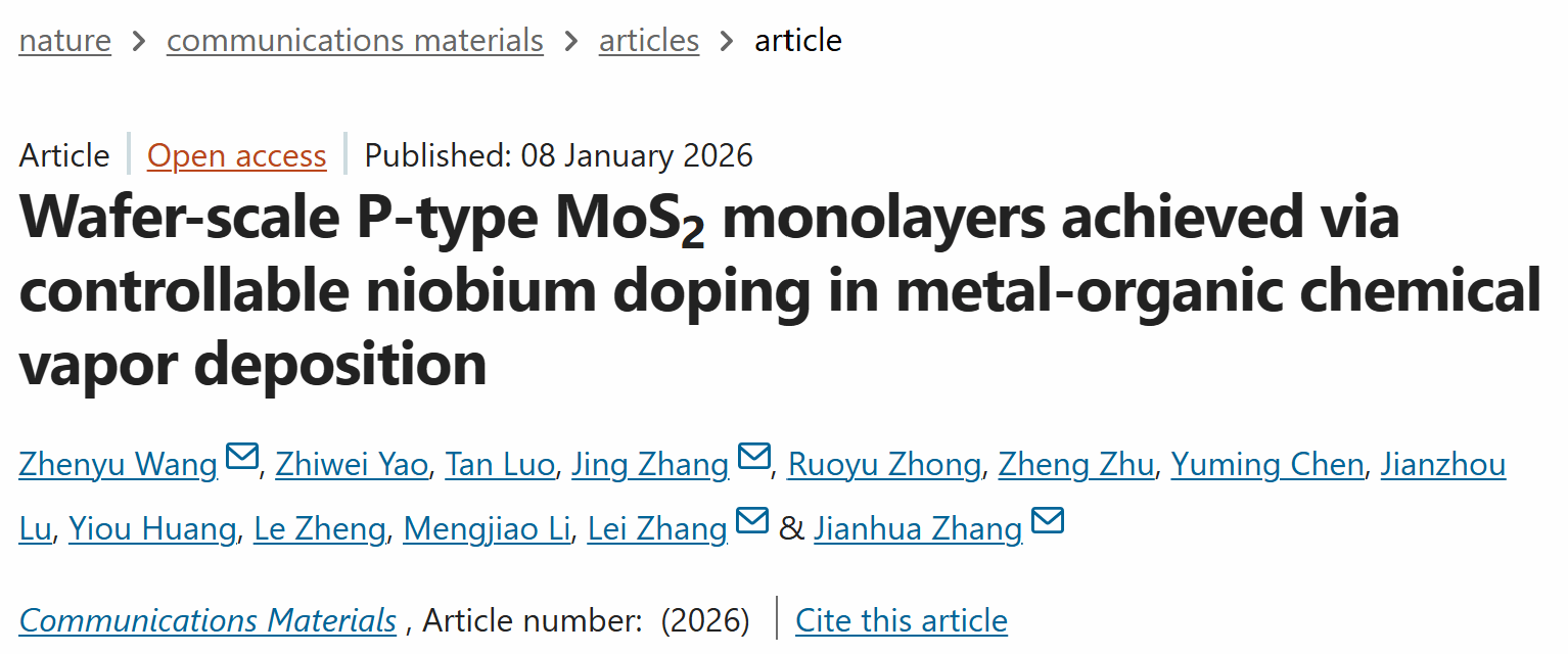 我院张建华教授/张磊教授/王震宇副教授团队在Communications Materials发表晶圆级p型MoS₂掺杂调控重要成果