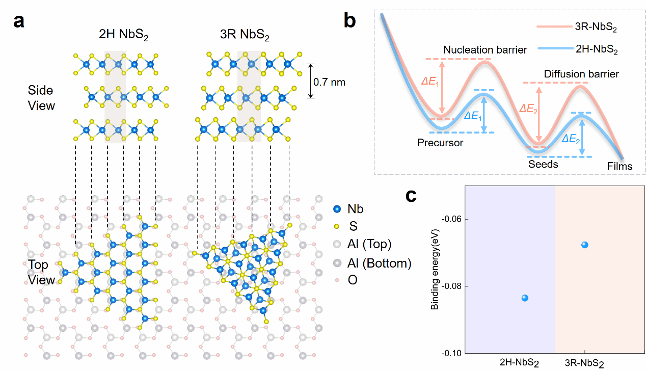 图3|衬底引导的2H-NbS₂选择性生长机制。a,2H相与3R相NbS₂在蓝宝石衬底上的原子结构模型。两种相均由Nb原子处于三角棱柱配位构成,但在层间堆垛方式上存在差异。下方展示了2H-NbS₂与c面蓝宝石六方晶格之间的外延界面关系,突出其晶格对称性匹配特征。b,生长过程中结合能的计算示意图。其中,ΔE₁表示NbS₂在蓝宝石台阶边缘处的成核结合能,ΔE₂表示畴横向扩展过程中吸附原子“攀爬”台阶时的结合能。相较于3R相,2H-NbS₂在两种能量项上均表现出更有利的结合特性,表明其在成核及吸附原子的动力学方面具有优势。c,2H相与3R相NbS₂在蓝宝石台阶上的形成能比较。在薄膜厚度为6 nm时,2H相的形成能为− 0.0835 eV,明显低于3R相的− 0.0676 eV,从而解释了实验中观察到的高相纯2H-NbS₂生长结果。