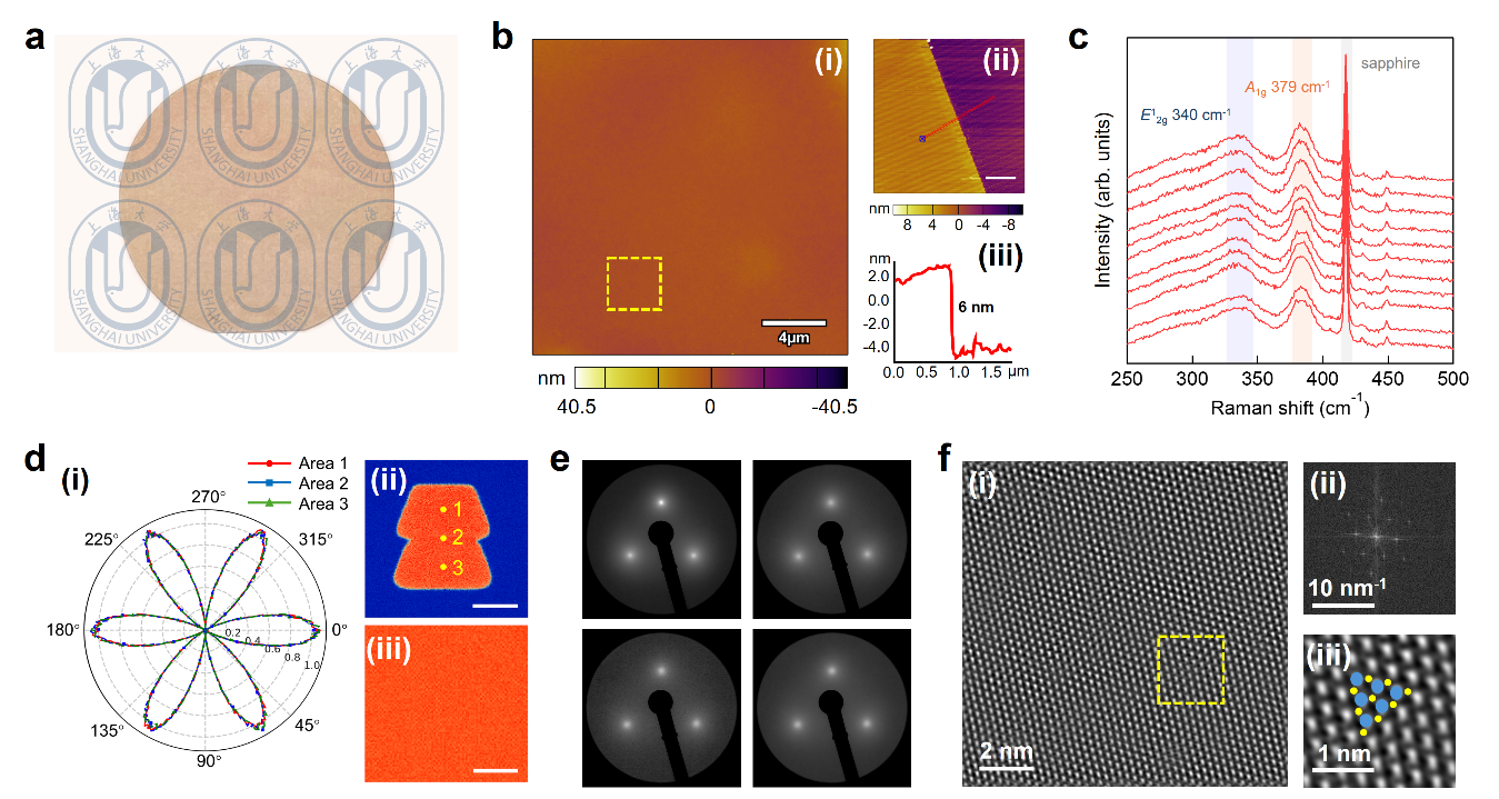 图2|晶圆级NbS₂单晶薄膜。a,生长于2英寸蓝宝石衬底上的NbS₂薄膜实物照片。b,(i)NbS₂在蓝宝石基底上的原子力显微镜(AFM)图像。黄色方框所示区域为均方根(RMS)表面粗糙度计算区域。(ii)NbS₂在蓝宝石基底上的AFM图像,通过人为划痕显示NbS₂与蓝宝石衬底之间的高度对比。比例尺:1 μm。(iii)是(ii)中对应线段的高度剖面,显示NbS₂薄膜厚度约为6 nm。c,室温条件下在2英寸NbS₂样品上进行的拉曼线扫描谱图,共采集11个光谱,测量间距为5 mm。d,(ii)与(iii)分别为合并NbS₂畴区(比例尺:5 μm)和连续NbS₂薄膜区(比例尺:10 μm)的偏振分辨二次谐波(SHG)成像。(i)为(ii)中标示的三个区域对应的SHG强度极坐标图(角度单位:°)。e,在2英寸NbS₂薄膜不同位置采集的典型低能电子衍射(LEED)图样。f,NbS₂薄膜的扫描透射电子显微镜(STEM)图像,显示其2H多型堆垛的晶格结构及对应的快速傅里叶变换(FFT)图像。(iii)为(i)中黄色虚线框区域的放大图像,其中蓝色球表示Nb原子,黄色球表示S原子.