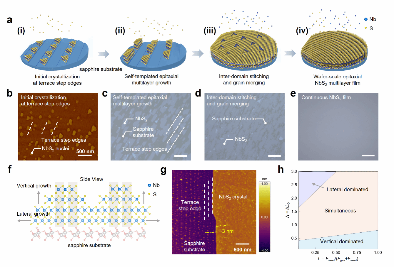 图1|基于金属有机化学气相沉积(MOCVD)的晶圆级NbS₂多层薄膜外延生长。a,NbS₂在2英寸c面蓝宝石上的四阶段外延生长过程示意图:(i)台阶边缘优先生核;(ii)自模板外延多层生长;(iii)畴并合与晶粒接合;(iv)连续外延薄膜的形成。b–e,与a中所示各生长阶段对应的原子力显微镜(AFM)及光学显微图像。(b)和(c)中的白色虚线表示蓝宝石衬底表面的原子台阶。c–e 的比例尺均为30 μm。f,NbS₂ 自模板外延生长机制示意图。吸附原子既沿基面边缘方向生长(水平箭头),又在已有台阶表面生长(垂直箭头),从而实现横向扩展与纵向堆垛的同时进行。g,高分辨率AFM图像,显示受蓝宝石衬底原子台阶限制的单晶NbS₂畴。白色虚线表示蓝宝石衬底的原子台阶,正在生长NbS₂畴的高度约为3 nm。h,模拟计算得到的相图,展示随前驱体通量比Γ = Fseed/(Fgas+Fseed)与归一化表面扩散长度Λ = ℓ/L₀ 变化的生长区间。其中,Fseed表示来自旋涂NbCl₅层释放的初始Nb通量,Fgas为MOCVD过程中持续供给的气相前驱体通量,ℓ为吸附原子的表面扩散长度,L₀为初始晶核尺寸。